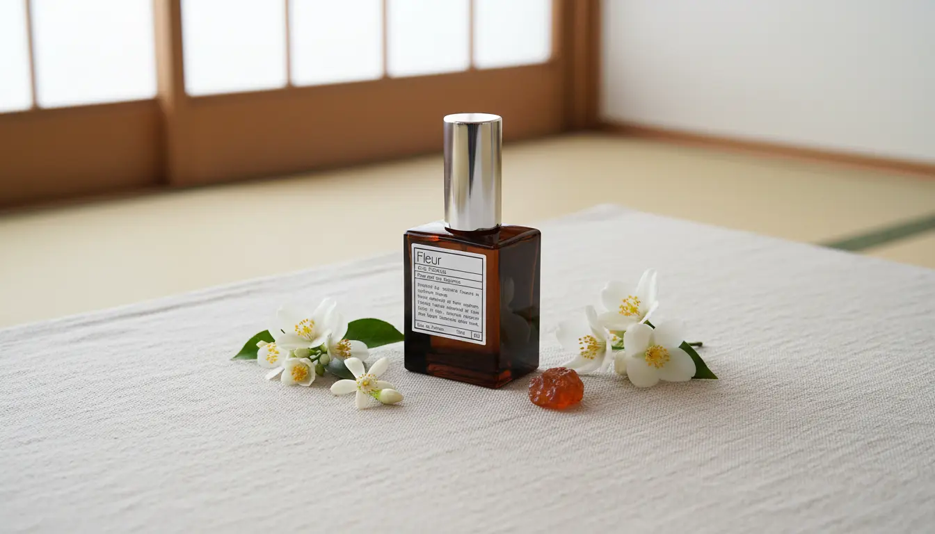 「フルール(Fleur)」は、その名の通り「花」を意味するフランス語。香りの構成は、ネロリ(ビターオレンジの花)のエッセンシャルオイル、ジャスミン・アブソリュート、そしてアンバーやムスクがベースとなっています。これは香水の世界において、フローラル系の「王道」とも言える組み合わせです。