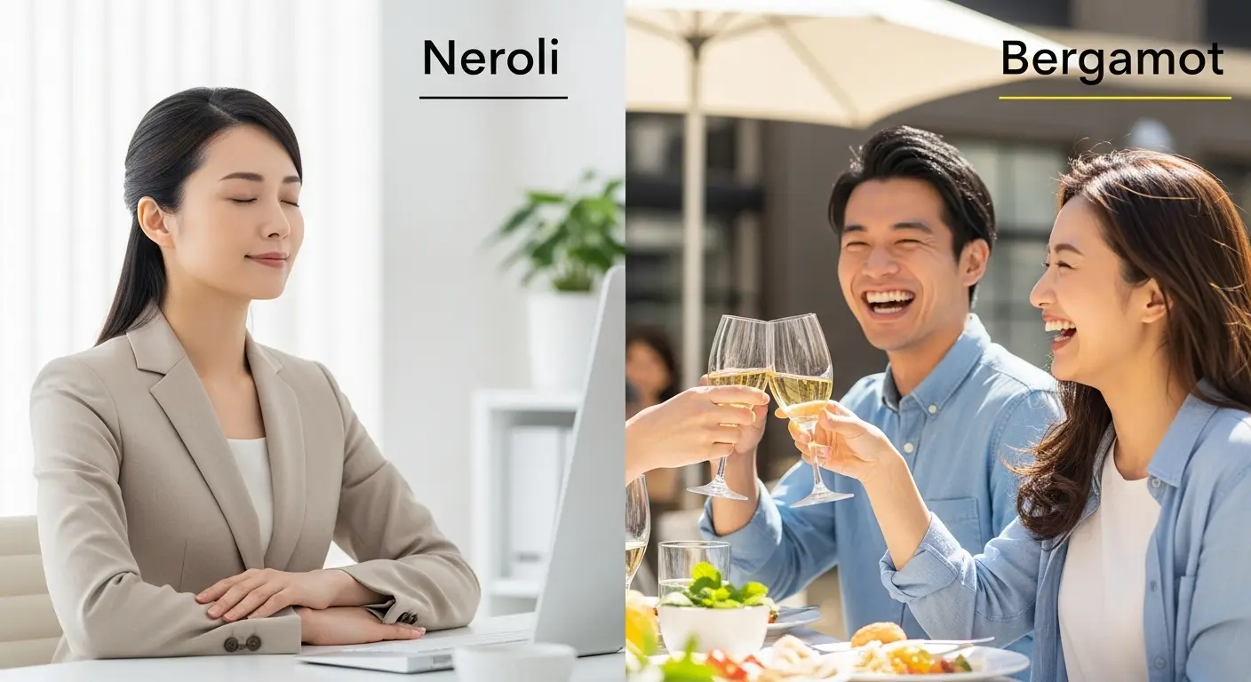 さて、二つの香りの「出自」と「物語」を理解したところで、いよいよ実践編です。「で、結局、私はどちらを、いつ使えばいいの?」という疑問にお答えしましょう。ネロリとベルガモットは、どちらもユニセックス(男女兼用)で使え、春夏の季節やビジネスシーンにも適しているという共通点があります。どちらも「清潔感」があるからです。しかし、その清潔感の「質」と、もたらす「心理効果」が異なります。