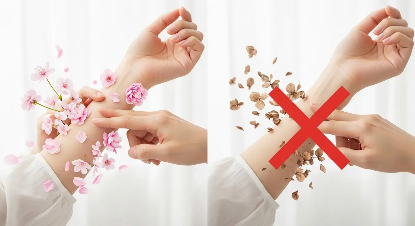 正しい付け方は、肌から15〜20cmほど離してスプレーし、「触らずに乾かす」こと。あるいは、反対の手首にトントンと優しくタップする程度に留めましょう。距離をとってスプレーすることで霧が細かくなり、空中で適度にアルコールが飛んでから肌に乗るため、よりソフトな香り立ちになります。