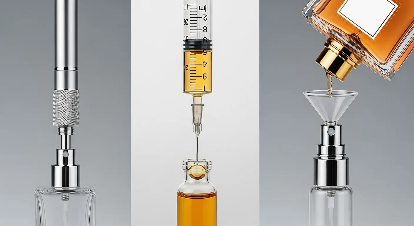 香水をアトマイザーに移し替える方法は、使用する道具によって大きく3つに分類されます。それぞれの方法で、空気への接触(酸化リスク)が異なるため、手順と注意点を理解することが重要です。