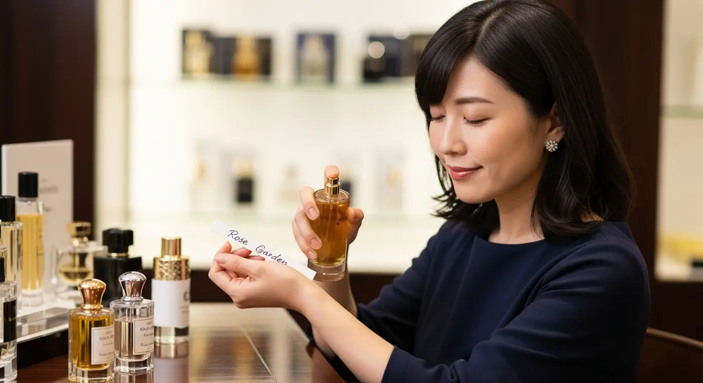 複数の香水を試す際は、「ムエット(試香紙)」を使って香りが混ざり合うのを防ぎます。ムエットで気に入った香りをいくつか絞り込んだら、次に手首などに直接つけて、香りの変化や持続性をじっくりと確かめてください。